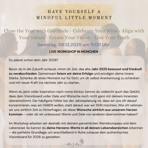 Im Live-Workshop erwartet dich eine liebevoll geführte Meditation und Journaling-Session zur Jahresreflexion, die dir hilft, innezuhalten, deine Erfolge zu feiern und das Jahr 2025 entspannt abzuschließen. Wir richten uns achtsam an deinen inneren Werten und Lebensbereichen aus. Lass dich inspirieren für deine 13 Rauhnachtswünsche und dein persönliches Visionboard, das du im Nachgang in Ruhe zuhause gestalten kannst. Es gibt Raum für Austausch und gemeinsames Teilen in einer kleinen, vertrauten Gruppe von maximal 10 Personen.