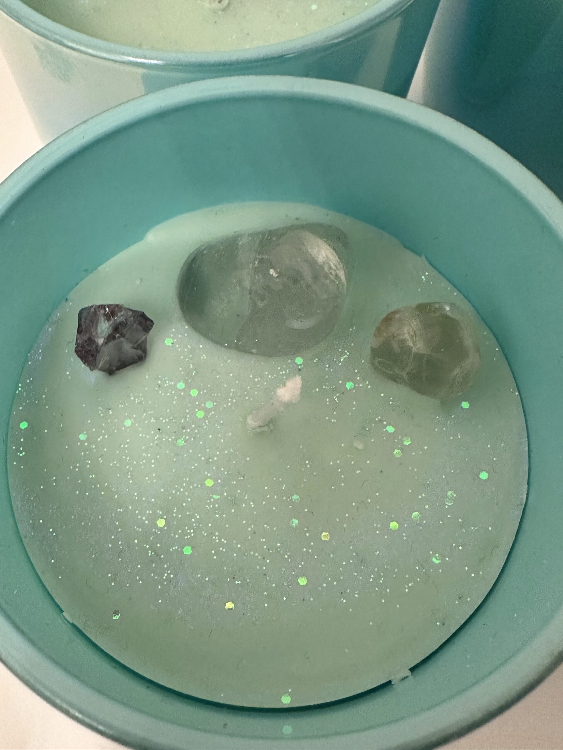 Erlebe neue Klarheit beim Lernen, Studieren oder Journaling mit der „Clarity“ Edelsteinkerze! Die handgegossene Kerze aus 100% Sojawachs verströmt einen sanften, frischen Duft von Zitronengras und schenkt dir positive Energie beim Fokussieren und Entspannen. Im schimmernden, aquamarinfarbenen Glas warten drei kraftvolle Edelsteine: Amethyst für Konzentration, Fluorit für Intuition und Balance, Bergkristall für klare Gedanken.